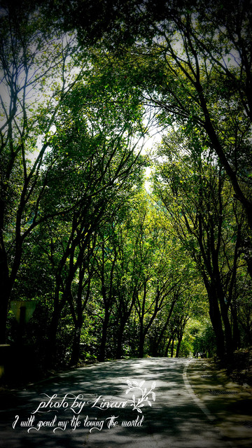夾道兩旁的樹成微微的長三角拱形狀,枝葉間篩落的陽光,美呆了!!